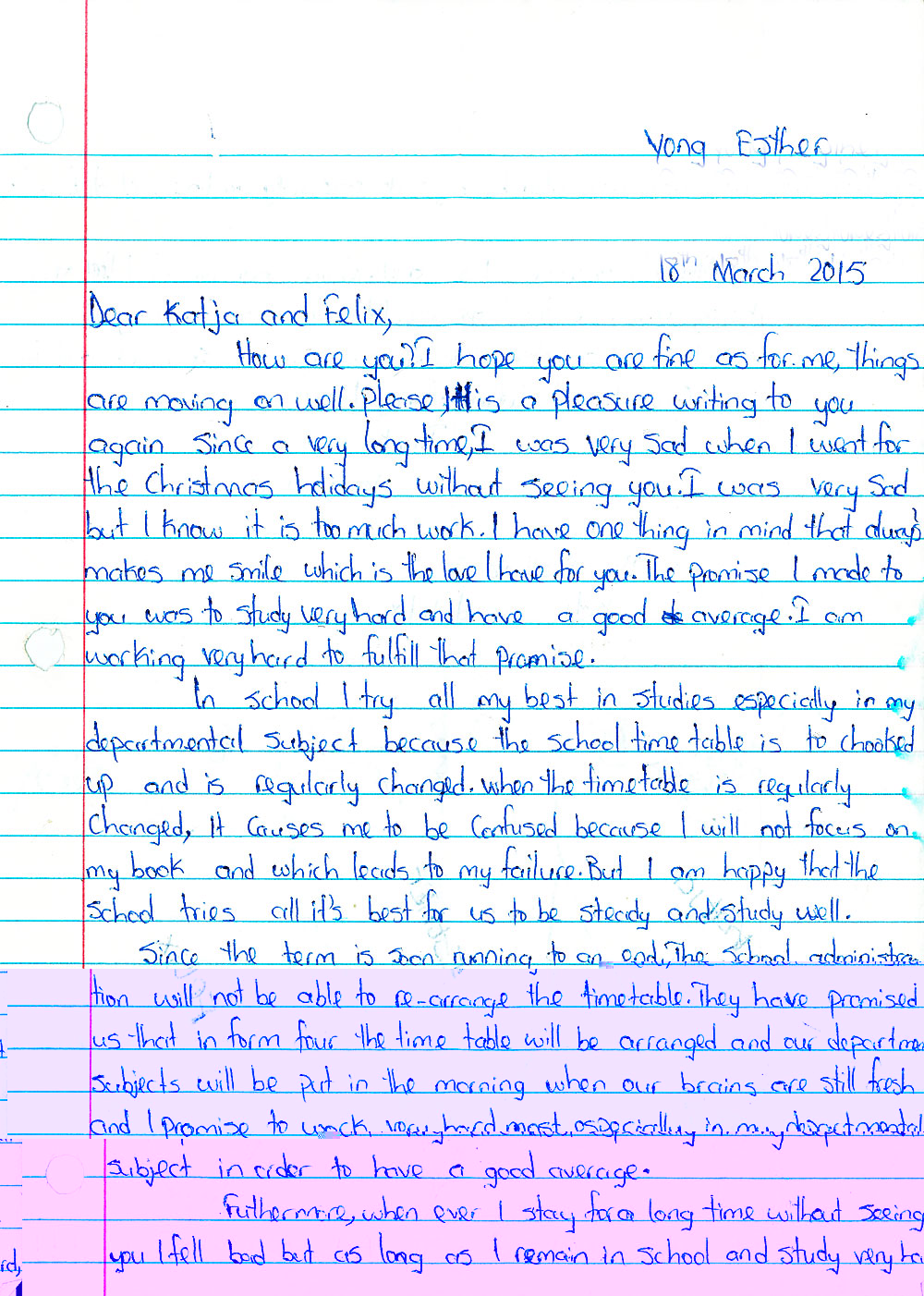 413 600 CFA (CHF 690.–) finanzieren wir Esther für das gesamte Schuljahr 2019/2020. Juli 2019: Dankesbrief von Senocia Juli 2019: Esther bedankt sich bei uns... ...mit einem langen, herzlichen Brief. Oktober 2018: Dankesschreiben von Esther August 2018: Dankesschreiben von Senocia Dear Katja and Felix Greetings from Diangha Senocia Natang and family. I am very happy for what you have done to my family. Happy for your educational support and very grateful that i passed the Advanced Level General Certificate Examination (A/L GCE) in three subjects. Thankful for your encouragement, i will like to continue my education in the university of Bamenda (Uba) studying accounting. My elder brother also passed the Higher National Diploma (HND) examination this year, my junior sister will be writing the